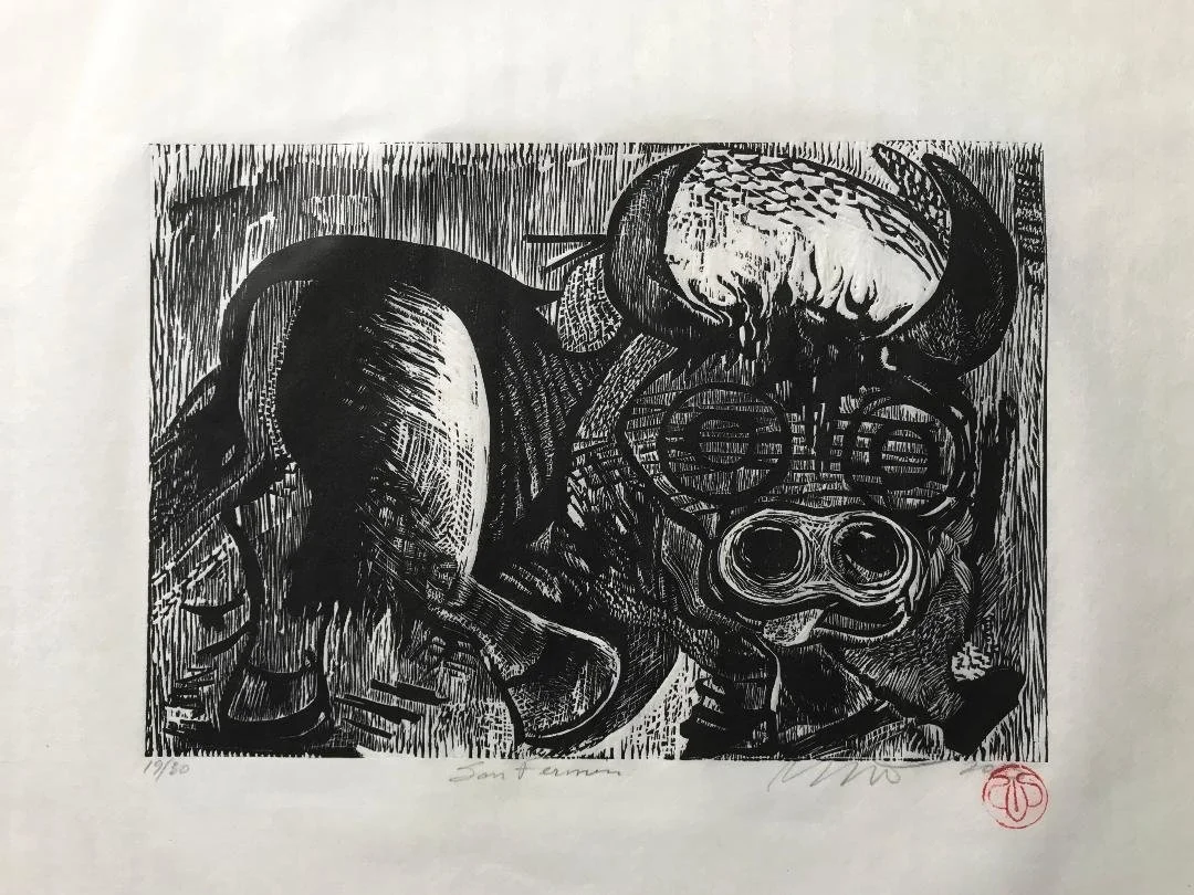 I was honored to be invited in 2013 and 2015 for the Artist in Residence position at Guanlan Original Printmaking Base in China. The three prints “San Fermin”, “Wheels” and “Maternity” in this portfolio are from wooden blocks carved and printed in China, where I was inspired to reduce my work to the most fundamental elements and express myself with the beauty of simplicity. During the summer of 2019, at Bihl Haus Arts, San Antonio I mounted a site-specific installation titled “Eel Road”. The exhibition included 44 mono-prints installed on the ceiling and walls of the gallery. The last three works are hand-pull relief mono-prints from that series.